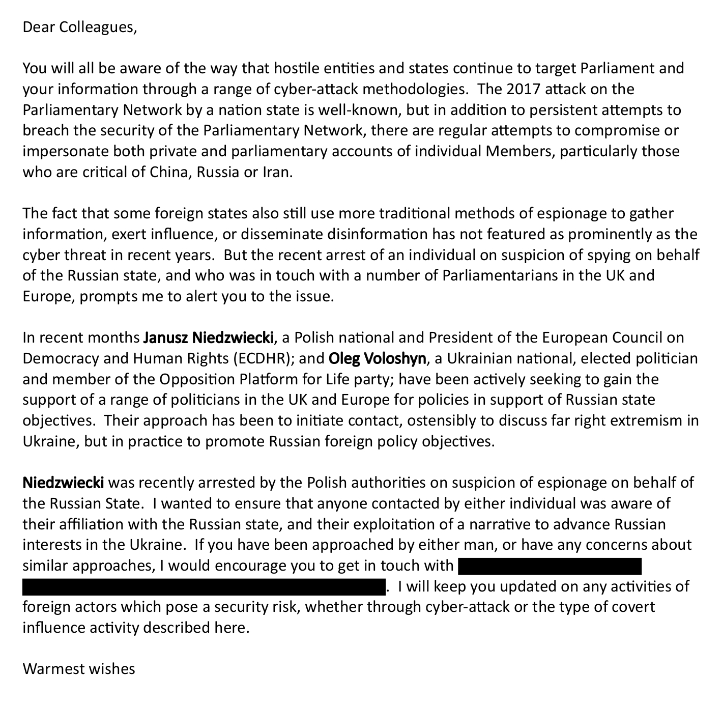 The latter moment is March 2025, while the former must be at least July 2021, when UK MPs received a letter warning them of Niedźwiecki’s and Voloshyn’s efforts “to gain the support of a range of politicians in the UK and Europe for policies in support of Russian state objectives”. See the letter below.