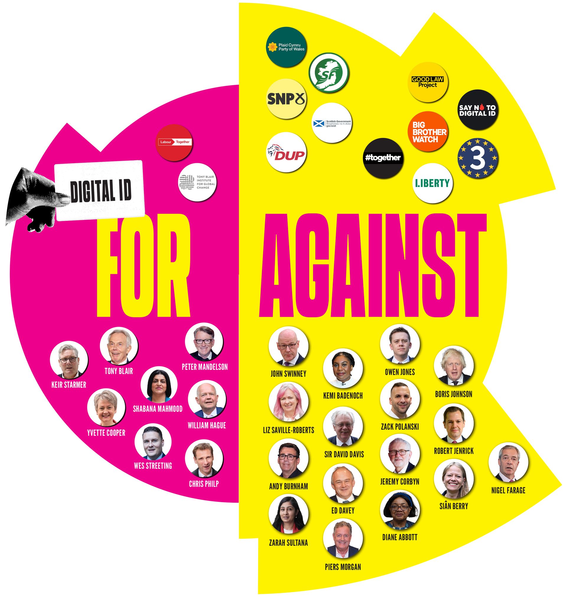 Graphic showing the organisations and public figures who have spoken out in support of or against the introduction of digital ID
