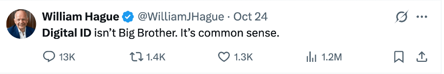 The pro-Digital ID list includes William Hague who authors reports, for which he’s presumably being paid, with Tony Blair for TBI, including one on Digital ID – a report forgot to mention in his tweet claiming the concept is simply ‘common sense’.