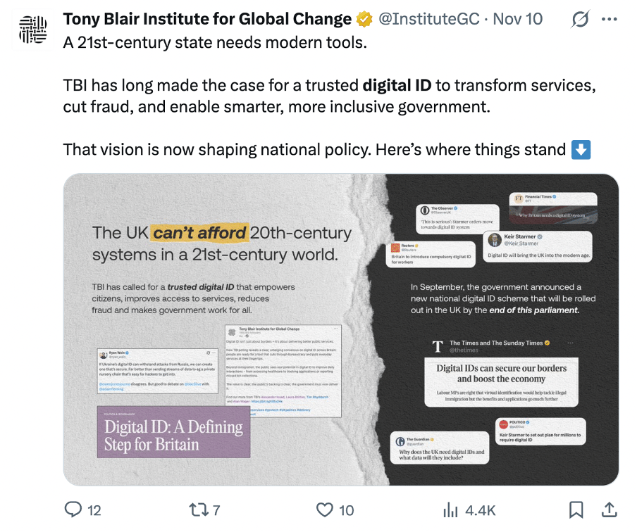 Tony Blair is an undeclared lobbyist. Ellison is his client. And TBI is an influencing machine whose tentacles spread across both the political and media establishments: if you read any article about digital ID that doesn’t include the Blair/Ellison connection, ask yourself why.