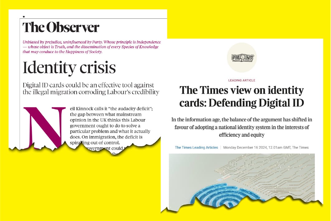 Leaders from the Observer (3 August 2025) and the Times (16 December 2024) in support of the introduction of Digital ID in the UK.