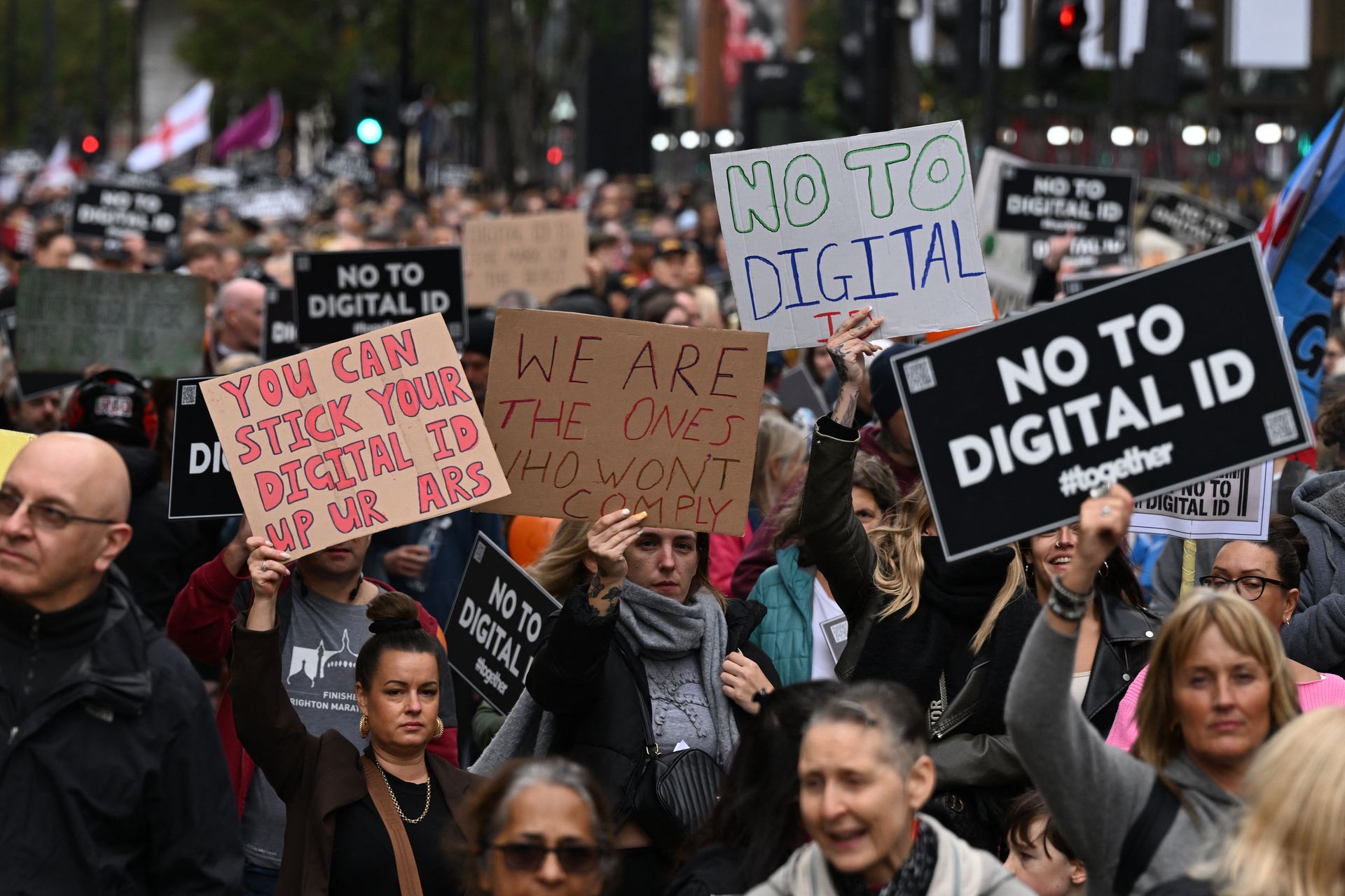 Demonstrators at a march against the implementation of digital ID cards, London, 18 October 2025. Photo: Chris J Ratcliffe / Getty