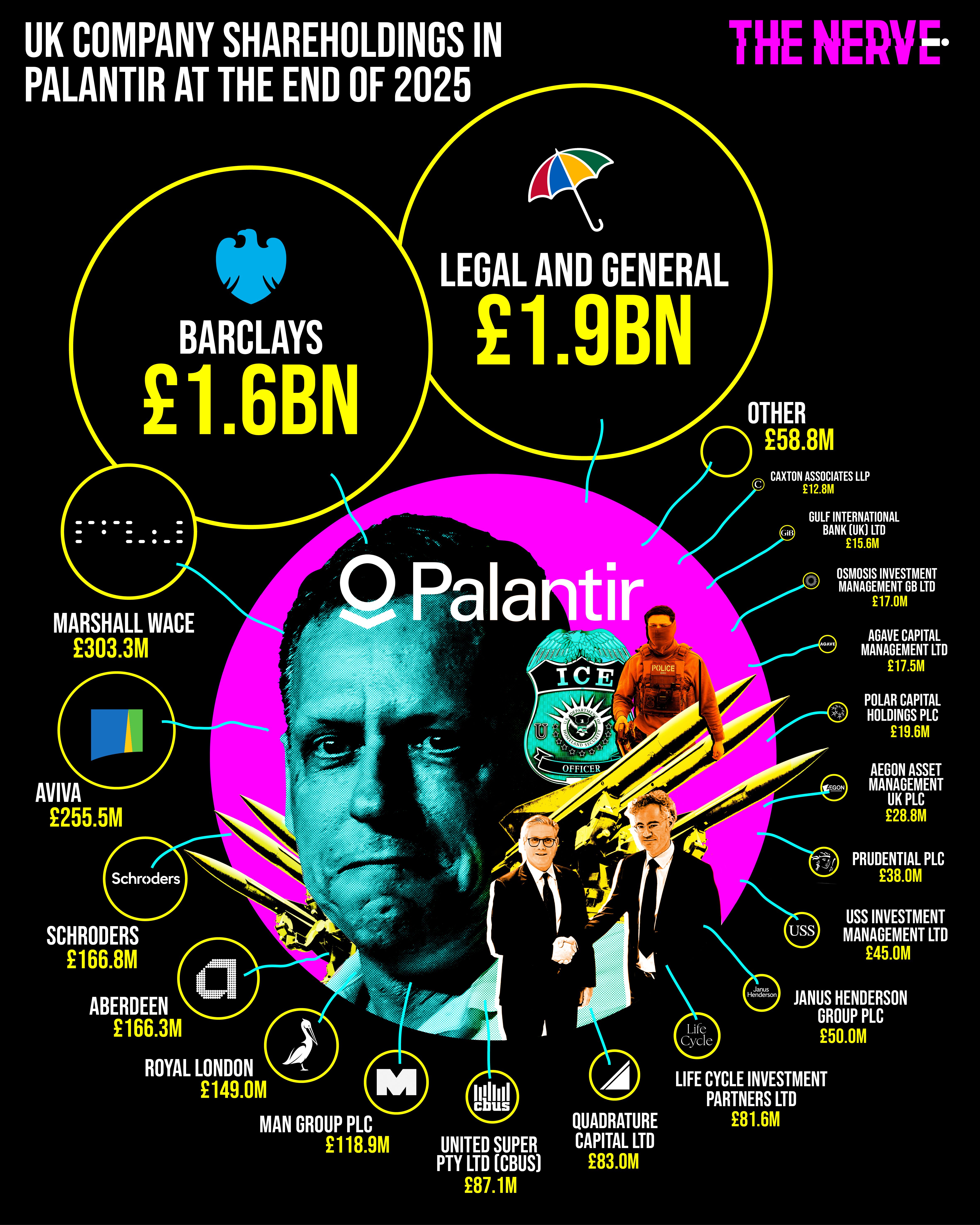 Aviva, another large UK pension provider, held £255.5m worth of shares in Palantir in the same period. Between them, the two companies provide up to one in three UK workplace pensions and the new findings suggest millions of Britons may be unwitting investors in the surveillance technology firm. (Full disclosure: four co-founders of the Nerve have pensions with Legal & General through their ex-employer, the Guardian.)