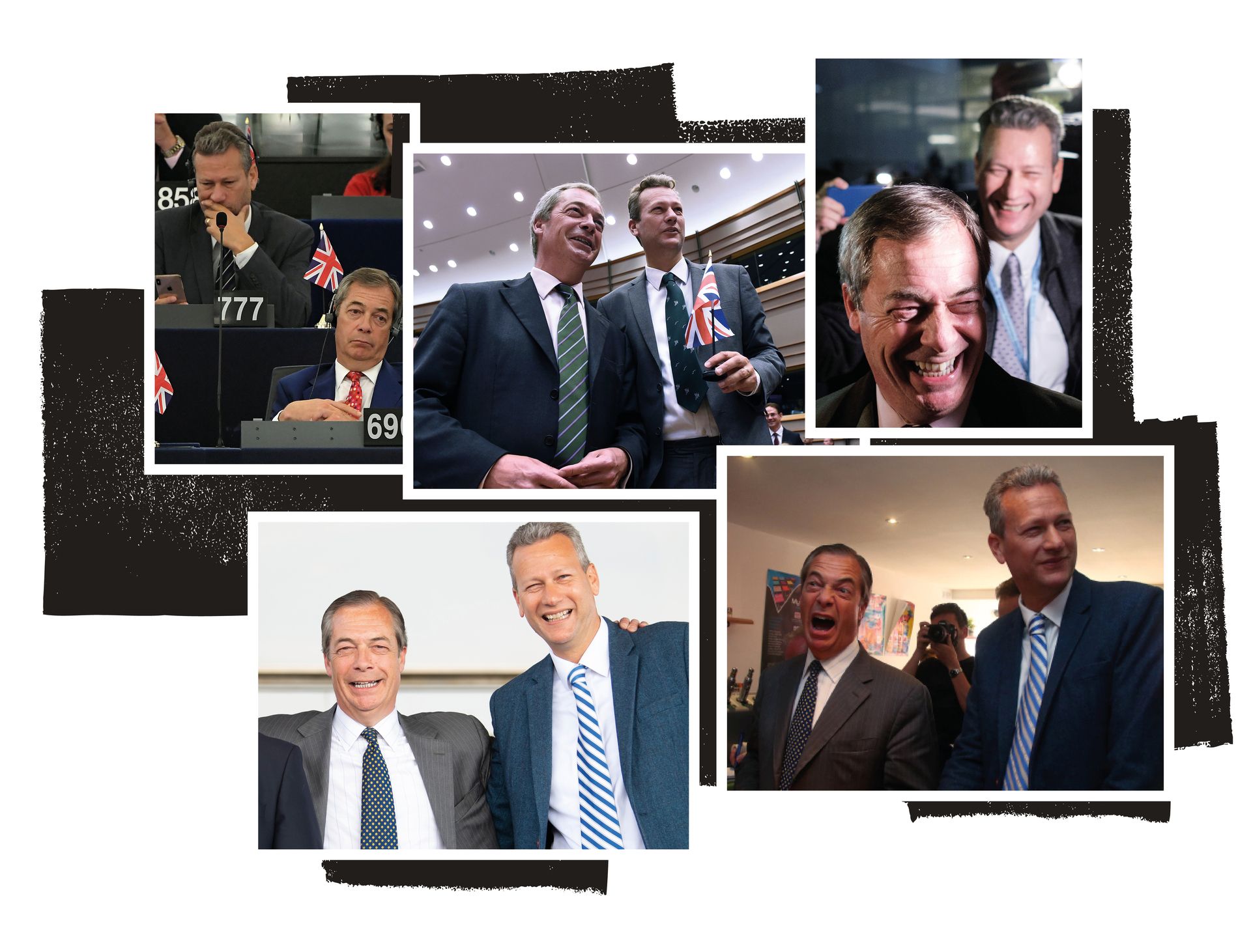 Nigel Farage and Nathan Gill pictured together, clockwise from top left: at the European Parliament, 2019; at EU headquarters in Brussels, 2016; in Brussels after a key vote on the Brexit agreement, 2020; at a vape shop in Merthyr Tydfil, Wales, 2019 and at the Senedd, Cardiff Bay, 2019. Photographs: Getty Images
