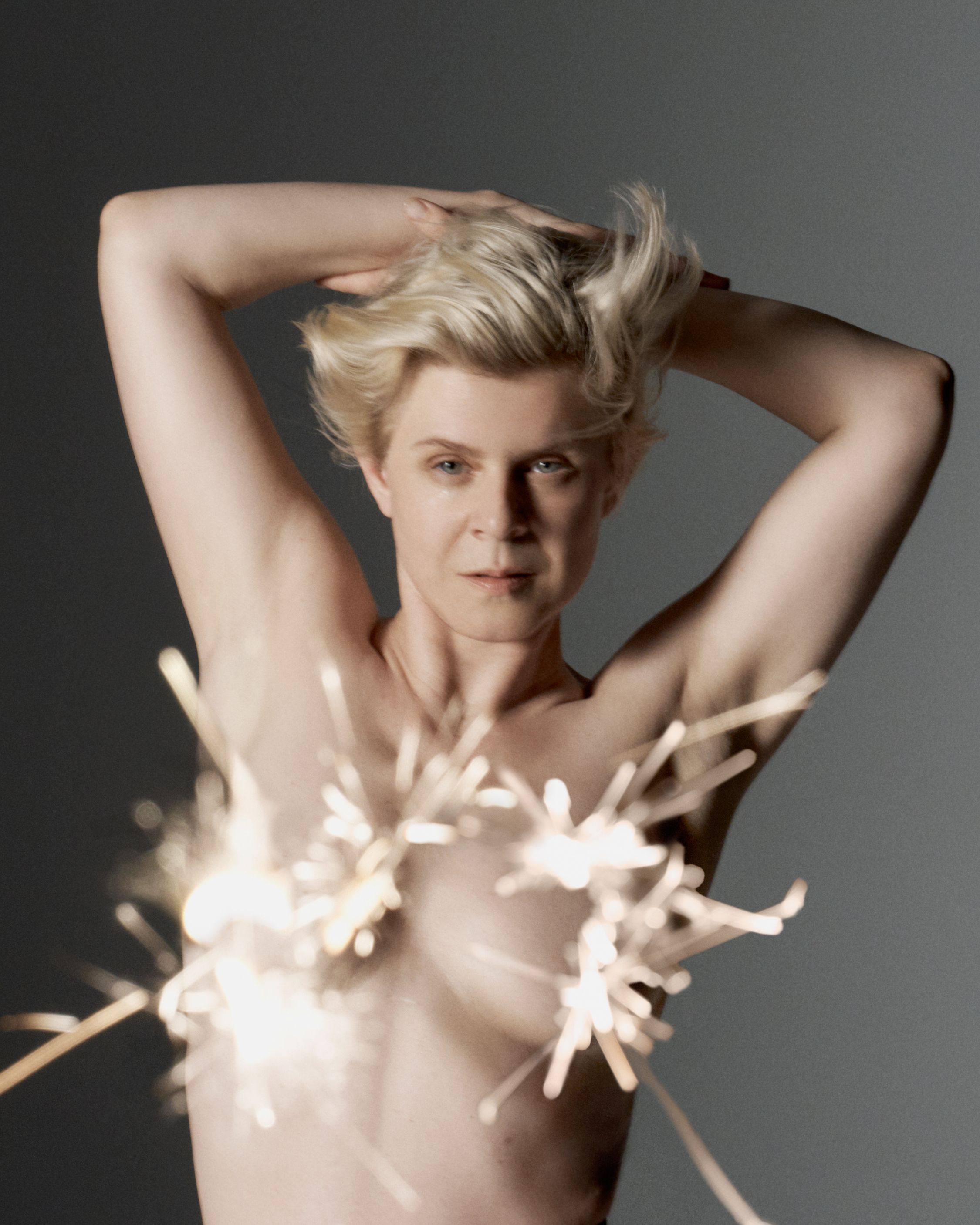 It’s one thing to go topless to claim power over something that might have once made you feel insecure. But it’s not like all the men are getting their bits out as well. So when Robyn returned this year with her first album in nearly a decade, led by the giddy rush of her single Dopamine and a crest of hype that reinstated her at the top of the pop pantheon, it briefly crossed my mind that she was playing into the boobs-as-fashion dystopia too. In the artwork for Sexistential, she’s holding her breasts in place with her fists, or covering them in firework-like patterns.