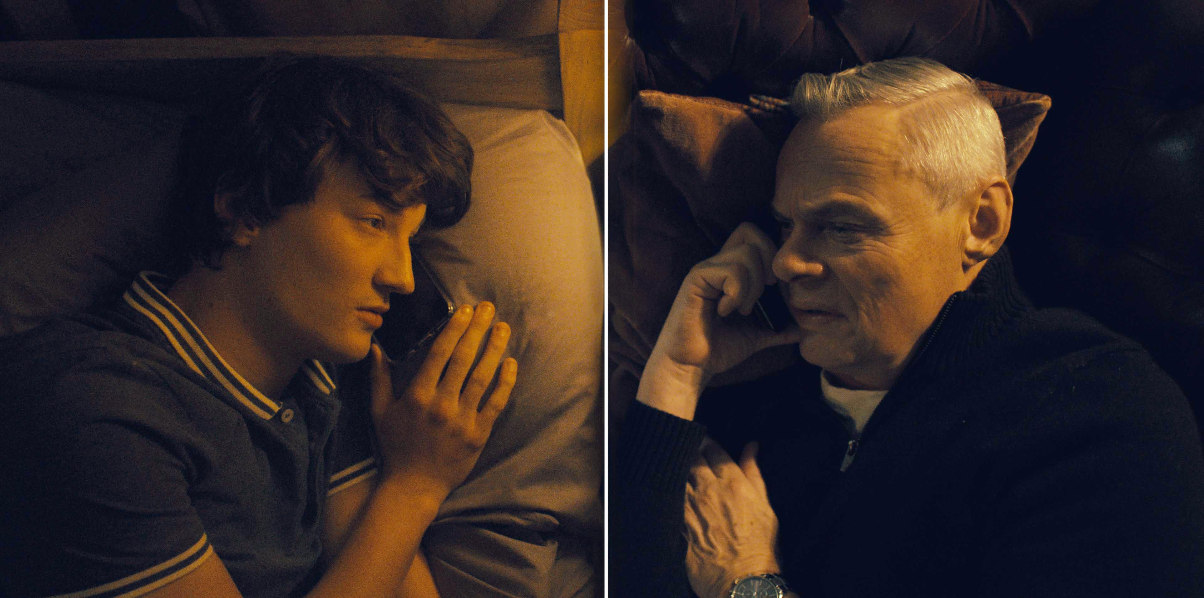 Left: Osian Morgan as victim 'Ryan', Martin Clunes as Huw Edwards. Photo: 5 Broadcasting Limited/PA