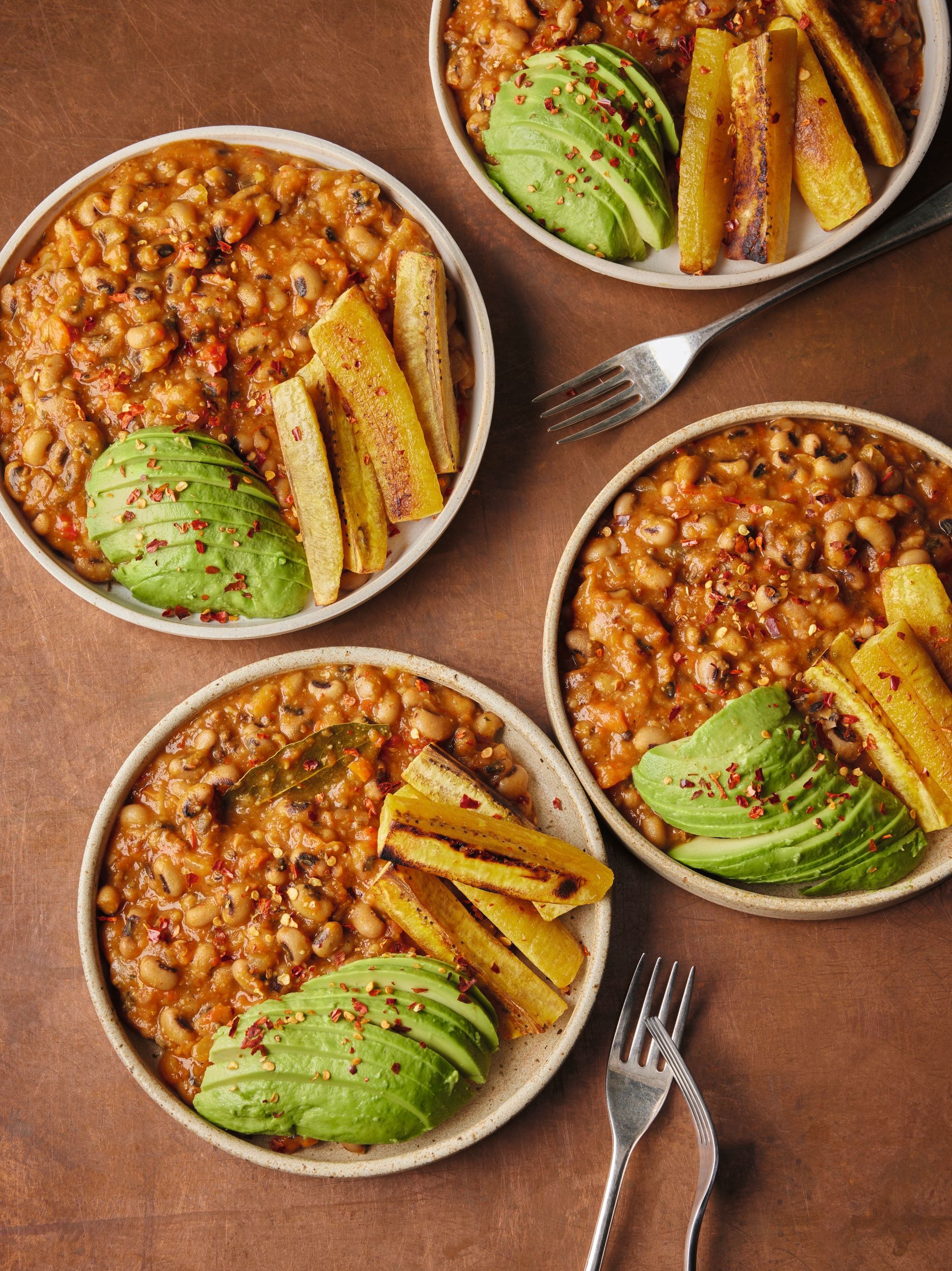 Serve the stew with the baked or fried plantains and avocado slices, garnished with chilli flakes.